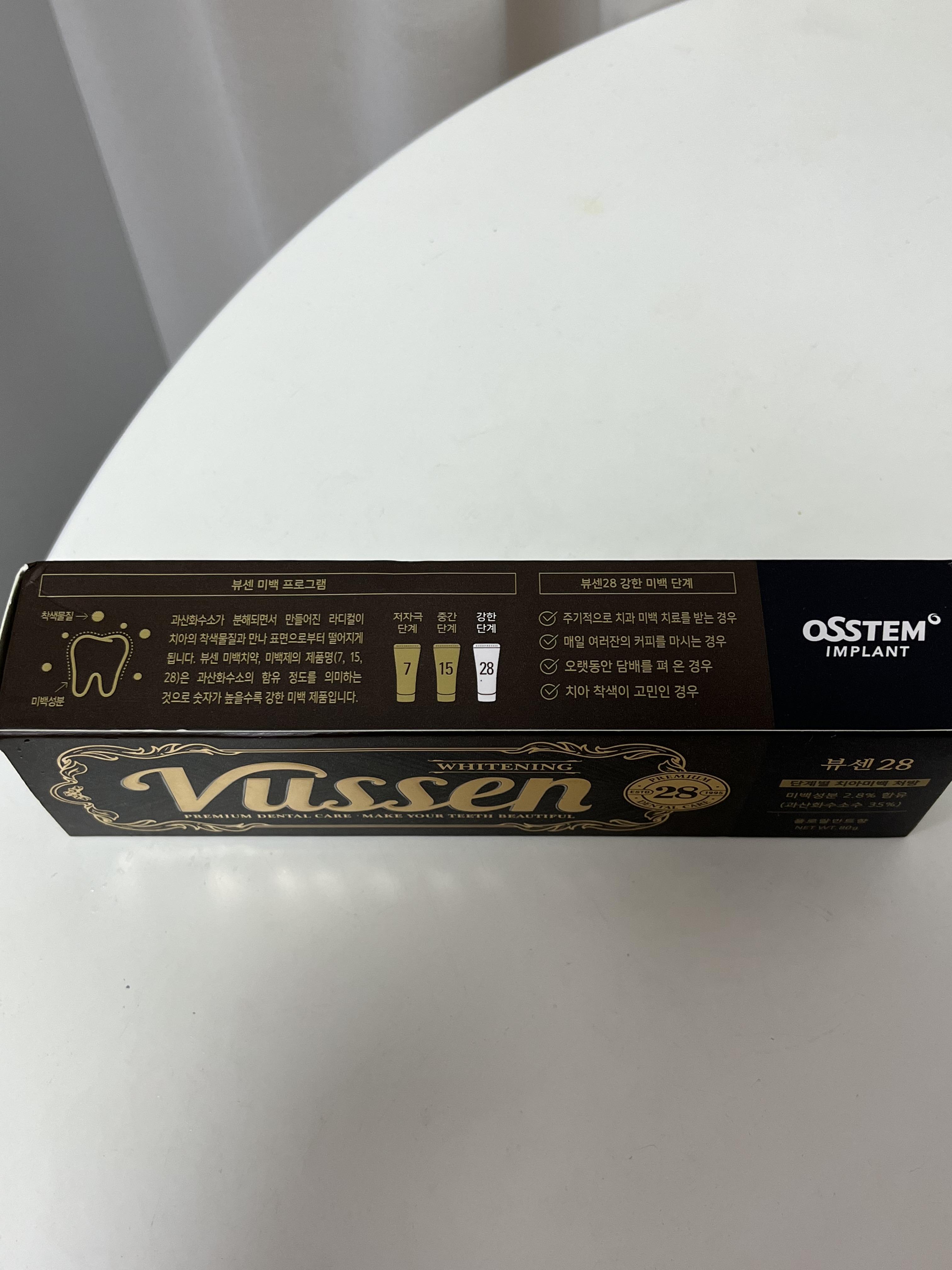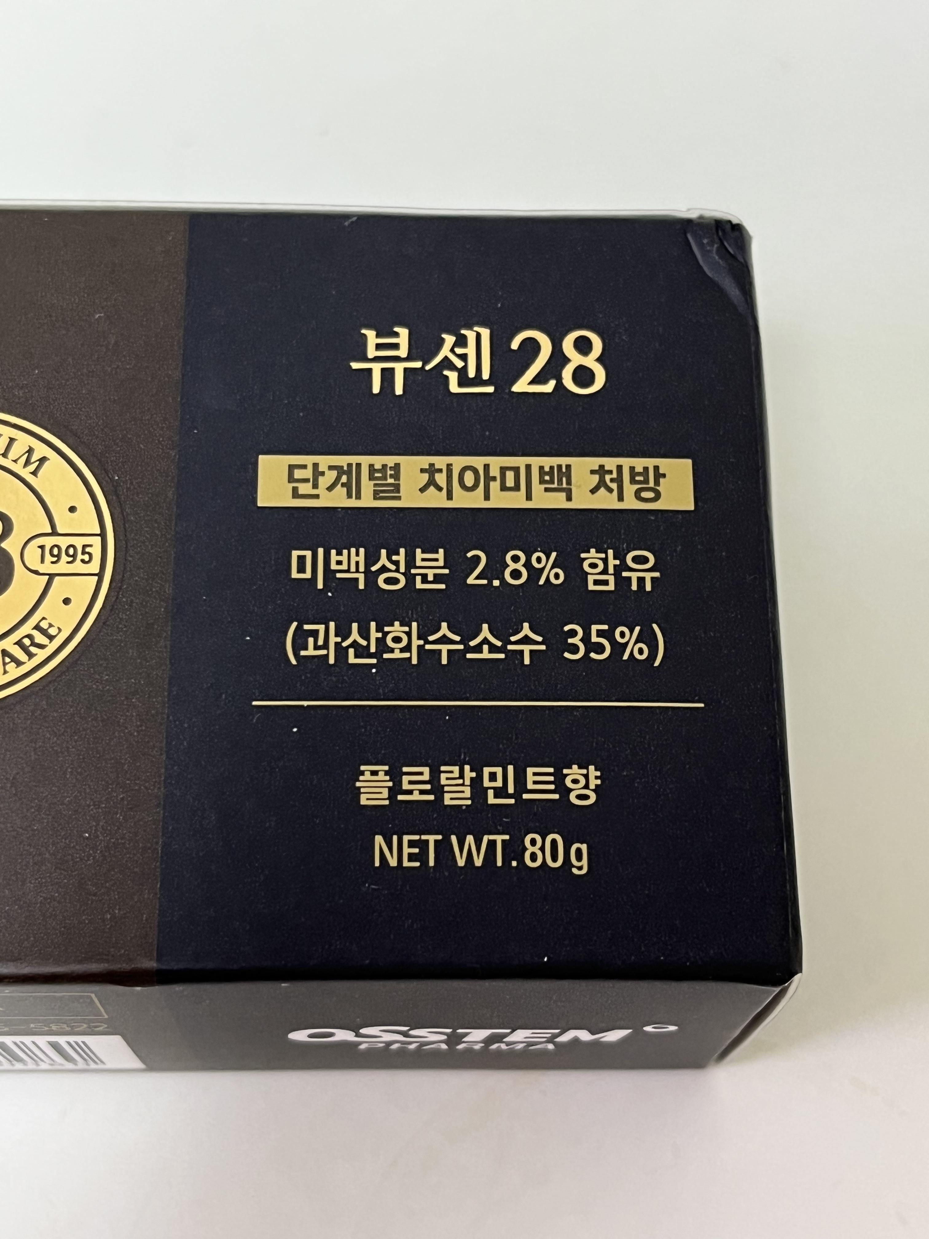 해외 제품의 경우 3%의 농도를 가진 치약도 있다고 들었는데, 국내 제품의 경우 뷰센 미백 치약 28이 가장 높은 농도로 알고 있습니다. 28의 의미는 2.8%의 농도를 가진다는 의미입니다.